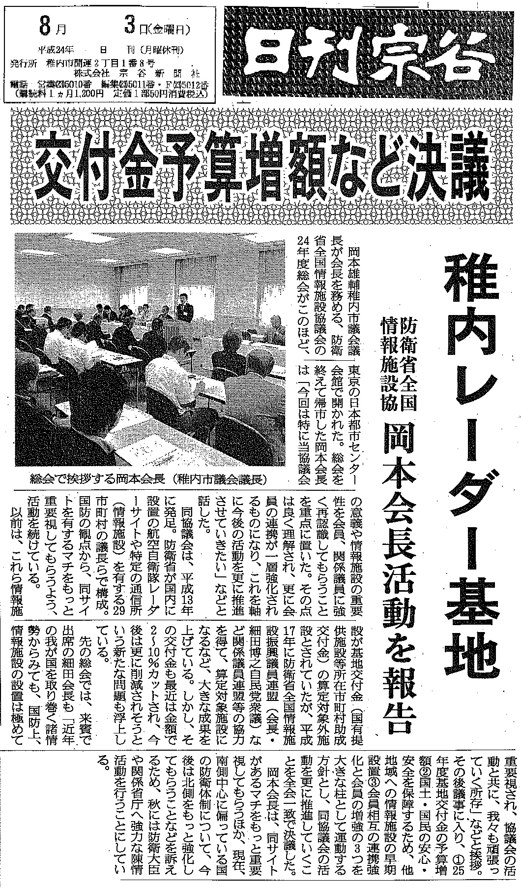 平成24年7月27日、防衛省全国情報施設協議会(岡本雄輔会長)は、東京の都市センター会館において、平成24年度監査会・理事会・総会を開催し、会員関係市町村議会議長、事務局長、防衛省情報施設振興議員連盟から細田博之会長ほか役員の代理として各秘書など48名が出席しました。